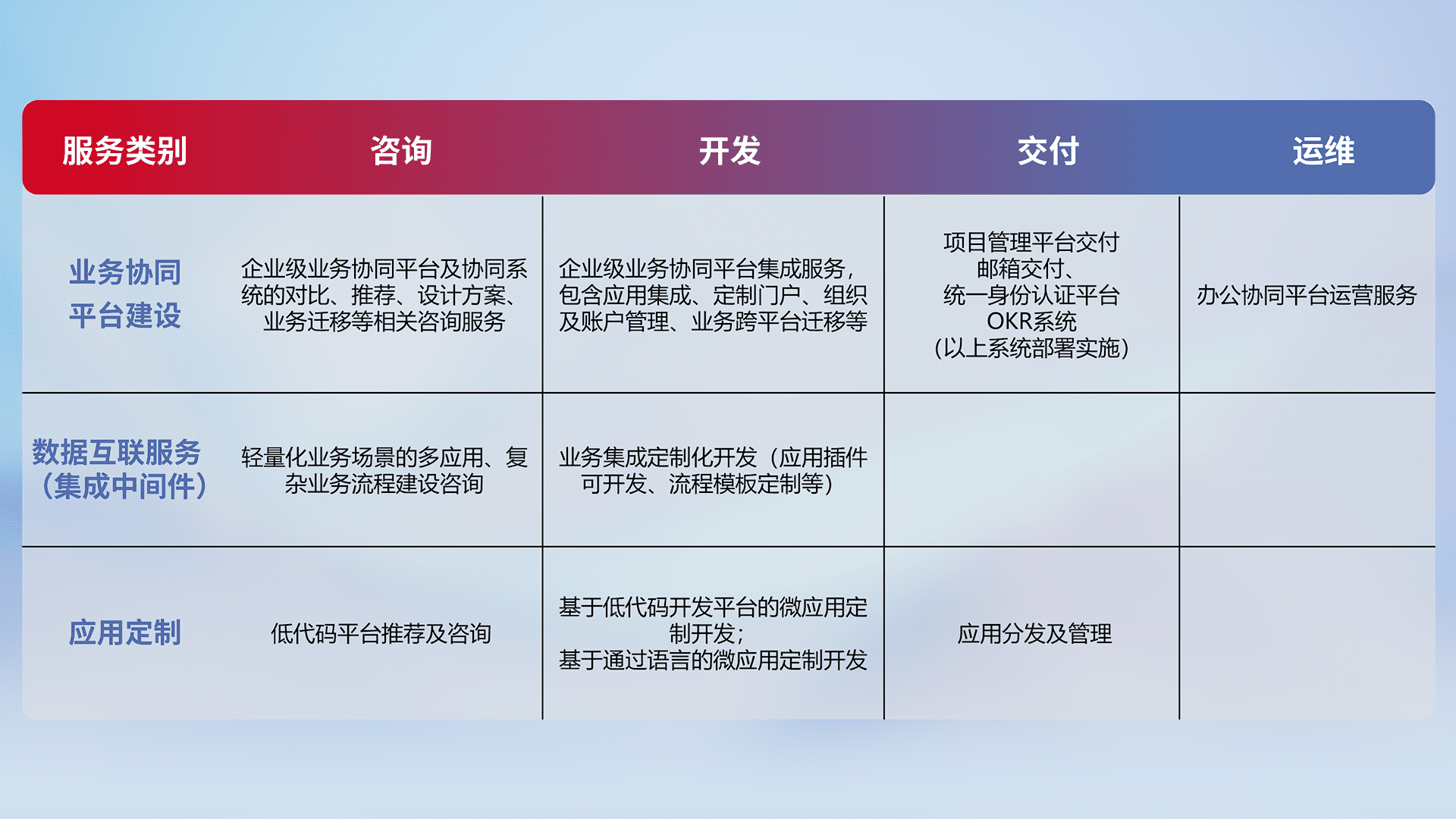 针对钉钉、、、、企微、、、IDaas等平台级产品提供产品的规划、、方案、、、交付、、、、定制化开发等服务,,,,实现如统一协同办公、、、智能客户服务、、混合会议管理、、、、智能数据查询、、、等业务场景,,,,实现数字化转型。。。。