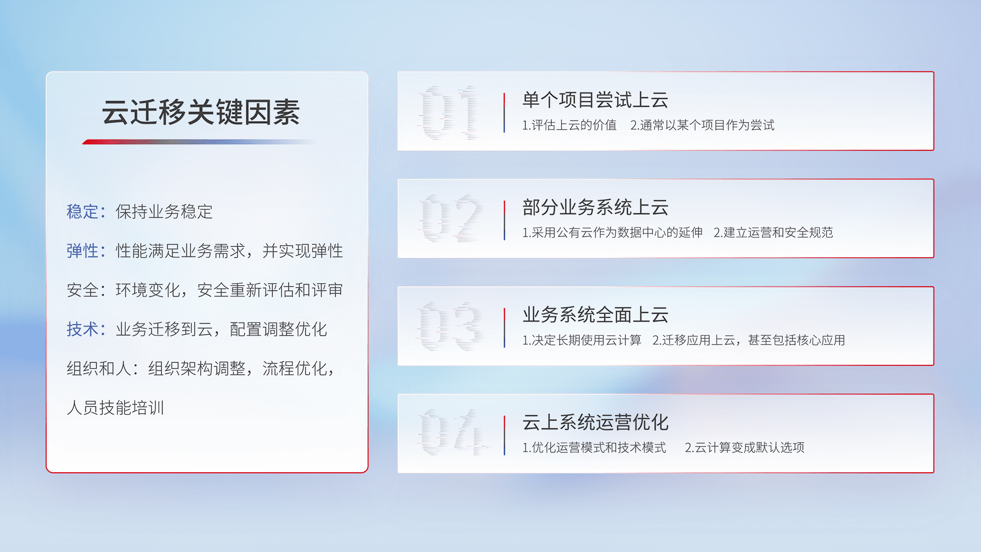 结合实际业务,,,,从规划设计、、、、云平台选型、、云原生改造、、数据迁移、、、、集成交付,,迁移全过程为客户识别最佳上云路径,,,,做好风险识别管理,,,,设计网络架构、、身份权限、、、、安全审计合规、、、、操作审计、、、、日志审计、、、、监控告警策略、、、多站点容灾设计等,,,,对云上基础设施进行整体规划,,提升IT治理水平,,以满足弹性、、、、高可用、、、、高性能的需求。。